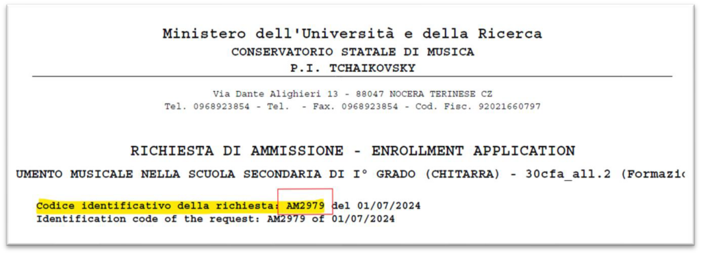 Nella graduatoria degli ammessi il candidato sarà indicato tramite il Codice identificativo della richiesta, il codice identificativo della richiesta di ammissione è visualizzabile nell’allegato ricevuto tramite email, all’indirizzo indicato, al momento dell’inoltro della domanda di ammissione. Il codice è preceduto dalle lettere “AM” .